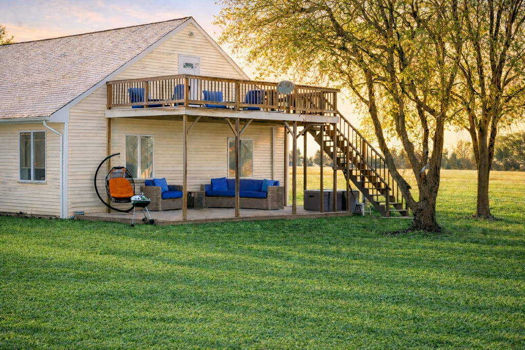 The guest house patio is a quiet extension of the stay—an inviting place to slow down and settle in. Sheltered beneath the deck above, it offers comfortable seating for morning coffee, afternoon conversations, or winding down as the sun sets. Surrounded by open green space and softened by warm light, the patio feels private yet connected, making it ideal for relaxed meals, shared laughter, or simply sitting still and enjoying the calm.